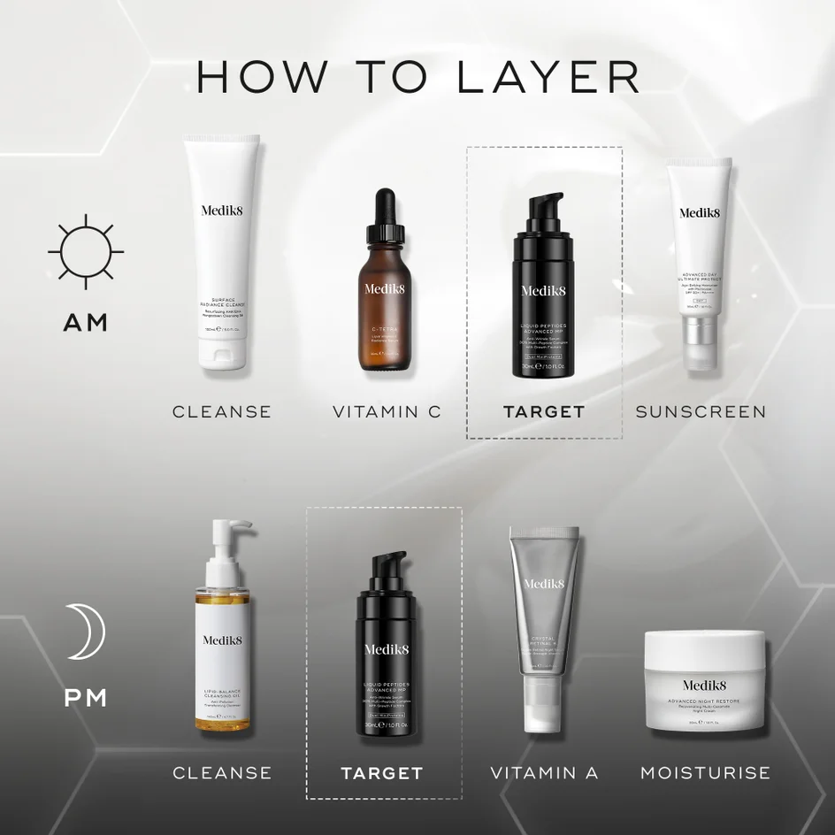 محصول Liquid Peptides Advanced MP از برند Medik8، سرمی پیشرفته برای مقابله با خطوط و چین و چروکهای صورت است. فرموله شده با ترکیبی از مینیپروتئینها (Dual MiniProteins™)، کمپلکس چندپپتیدی ۳۰٪، و هیالورونیک اسید میکرو-کپسوله که هدف آن کاهش سریع خطوط بیان (expression lines) و بهبود خطوط عمیقتر در طول زمان است.